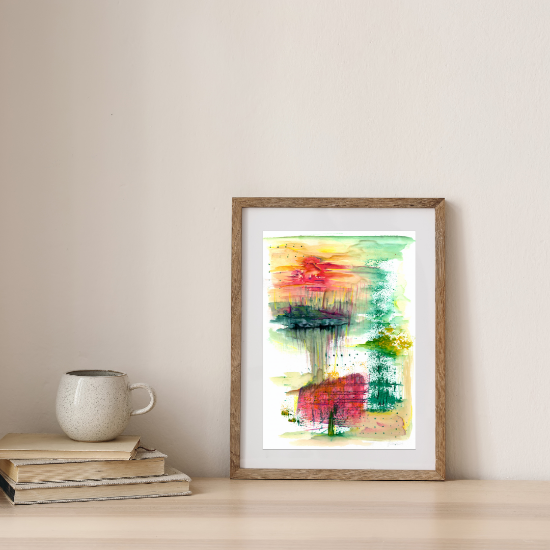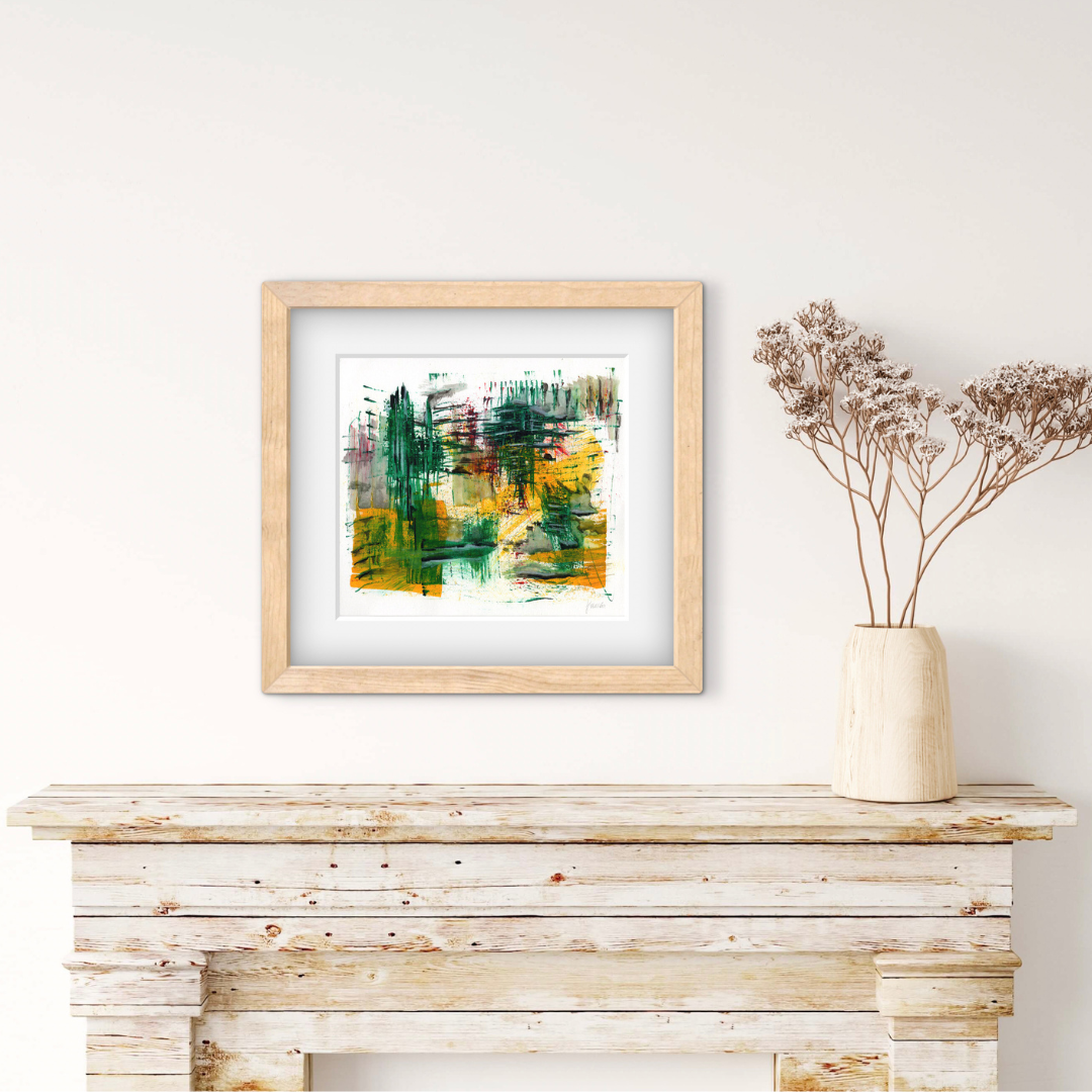 Firmada, cuidadosamente enmarcada con materiales libres de ácidos para que dure en el tiempo, lista para colgar y disfrutar.